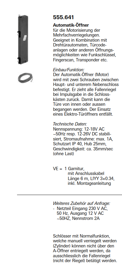 Schüco Jansen Janisol HI Türen, Automatik-Öffner für die Motorisierung der Mehrfachverriegelungen, Artikelnummer 555.641
