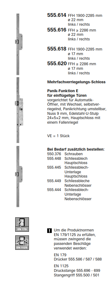 Schüco Jansen Janisol HI Türen, Mehrfachverriegelungs-Schloss Panik-Funktion E, Artikelnummer 555.618, FFH 1900mm ø 17mm