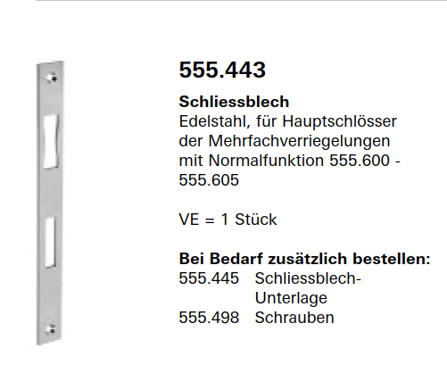 Schüco Jansen Janisol HI Türen, Schliessblech Edelstahl, für Hauptschlösser der Mehrfachverriegelungen, Artikelnummer 555.443