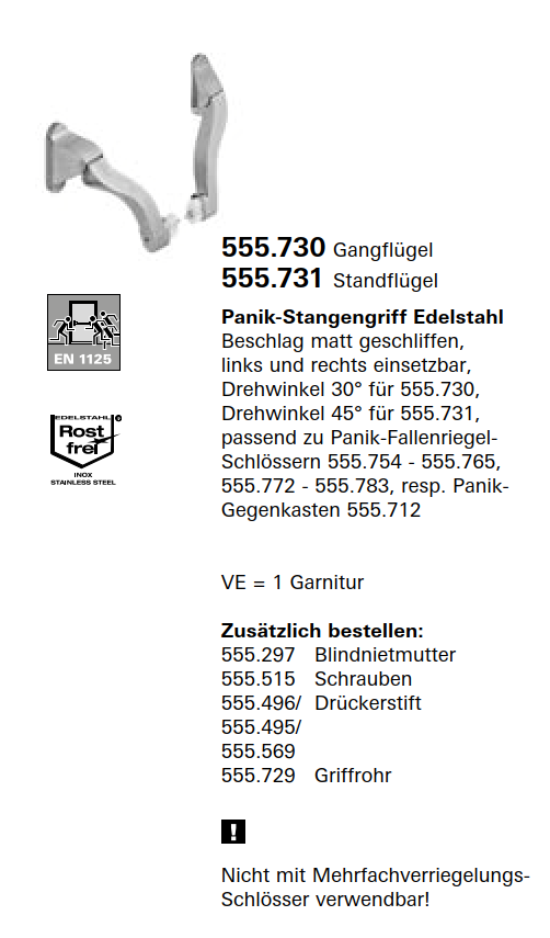Schüco Jansen Panik-Stangengriff Edelstahl Beschlag matt geschliffen, Artikelnummer 555.730, Gangflügel links und rechts einsetzbar