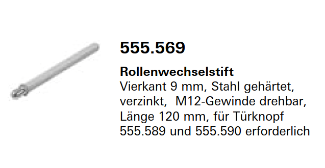 Schüco Jansen Rollenwechselstift Vierkant 9 mm, Stahl gehärtet, verzinkt, M12-Gewinde drehbar, Artikelnummer 555.569, Janisol HI Türen.