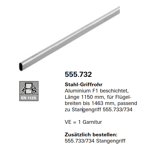 Schüco Jansen Stahl-Griffrohr Aluminium F1 beschichtet, Länge 1150 mm, Artikelnummer 555.732