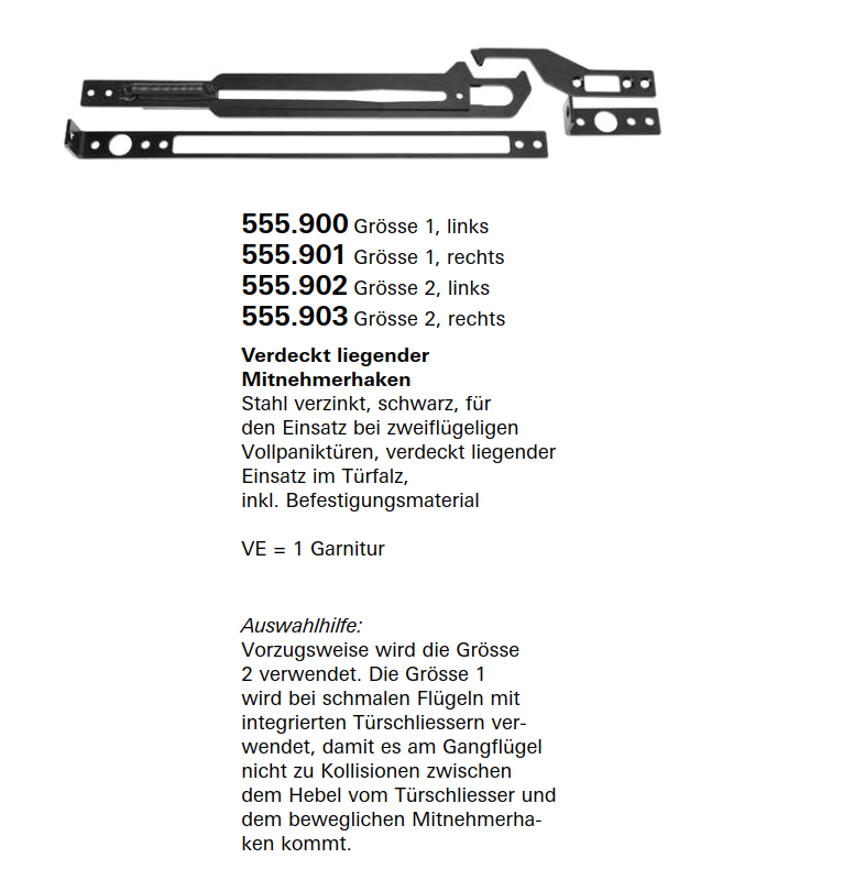 Schüco Jansen Verdeckt liegender Mitnehmerhaken Stahl verzinkt Grösse 1, rechts, Artikelnummer 555.901, Janisol HI Türen
