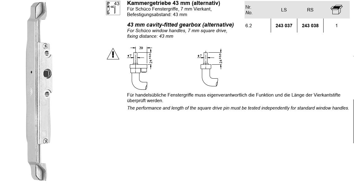 Schüco Kammergetriebe 43 mm für Aluminium Fenster Alte Nr. 219899 RS Neue Nr. 243038 RS