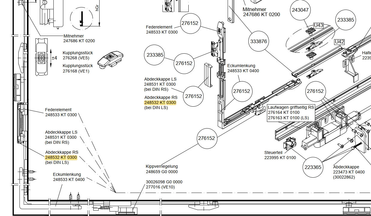 Schüco Komplettbeschlag PASK a 130kg RS iw, 248532 KT 0300 RS LS, für PASK
