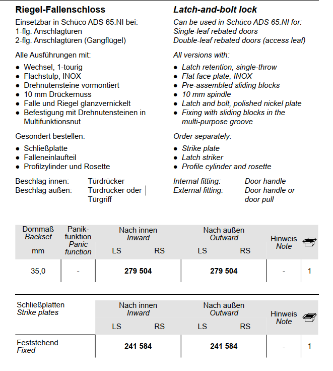 Schüco Riegel-Fallenschloss, 279 504, ADS 65.NI