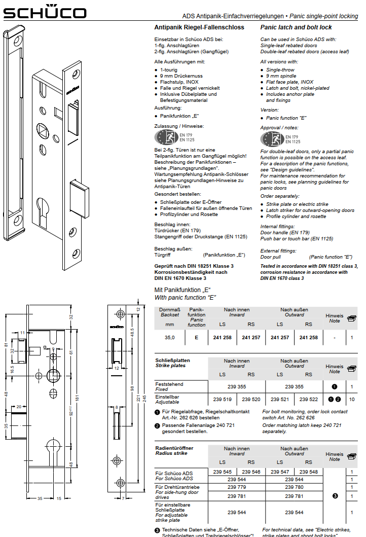 Schüco Riegel-Fallenschloss Antipanik, 241 257, ADS nach außen LS, mit Panikfunktion E