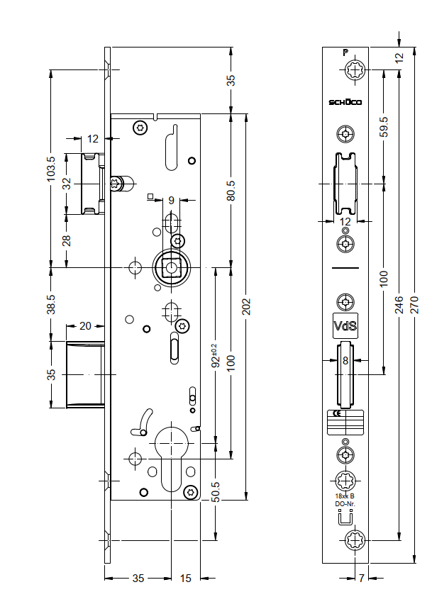 Schüco Riegel-Fallenschloss Antipanik, 241 257, ADS nach innen RS, mit Panikfunktion E