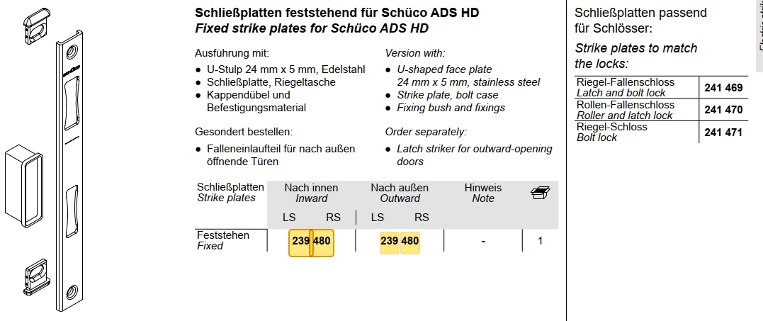 Schüco Schließplatten feststehend für Schüco , 239 480, ADS HD