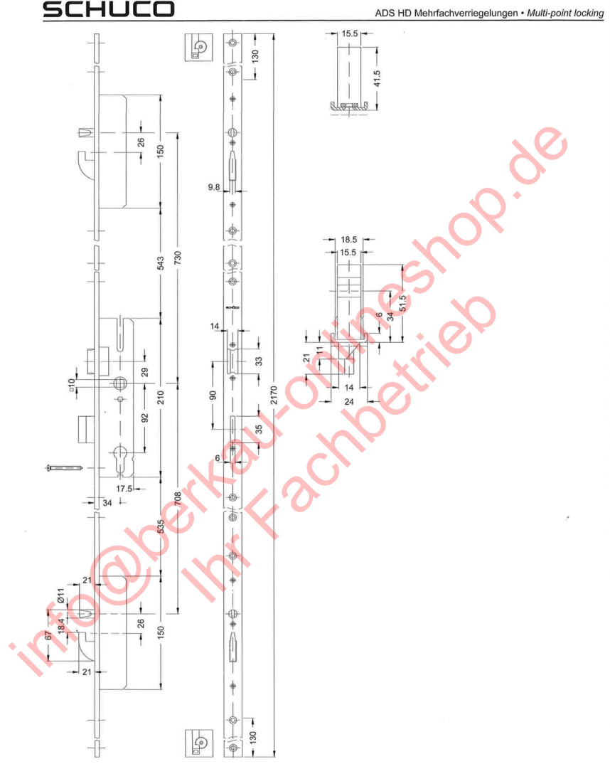 Schüco Schwenkriegel-Bolzenschloss, Mehrfachverriegelung, 211473, Dornenmaß 34 mm