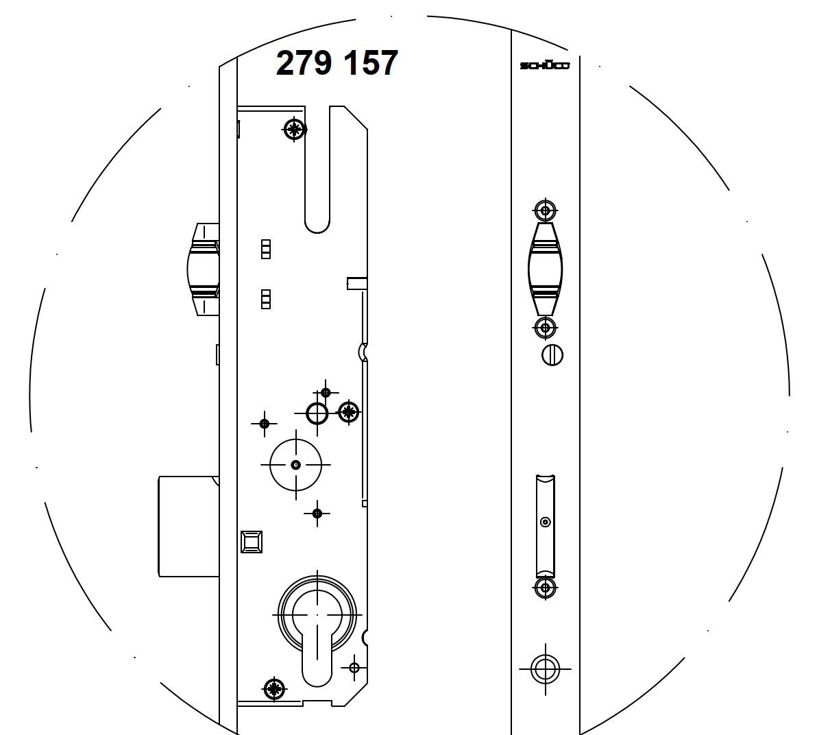 Schüco, Schwenkriegel-Bolzenschloss, Mehrfachverriegelung, mit Rollenfalle, 279157, Dornmaß 39,0 mm