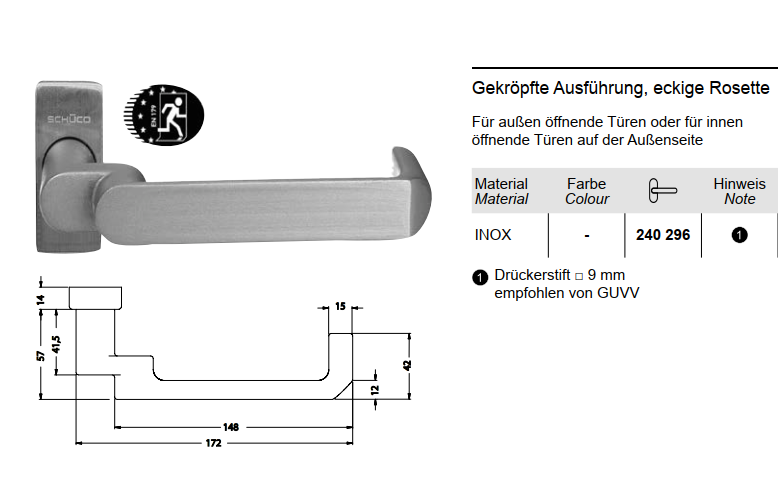 Schüco Türdrücker, Türgriff für Antipanikschlösser mit 9er Nuss, 240296, gekröpft