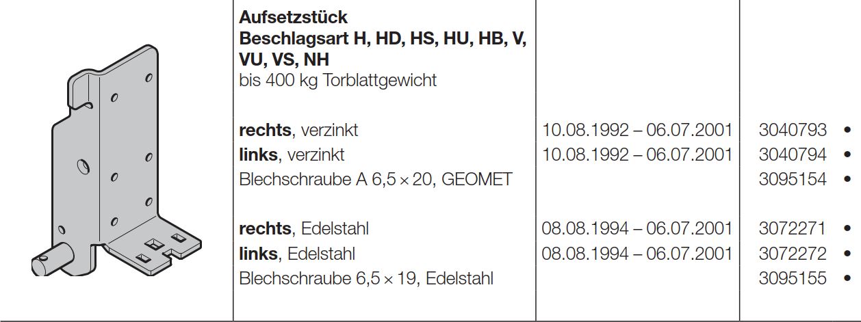 Hörmann Aufsetzstück, Bautiefe 42 Beschlagsart H, HD, HS, HU, HB, V, VU, VS, VB, NH der Baureihe 30-40-50 rechts