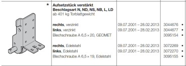 Hörmann Aufsetzstück verstärkt Edelstahl der Baureihe 30, 40, 50 Beschlagsart links