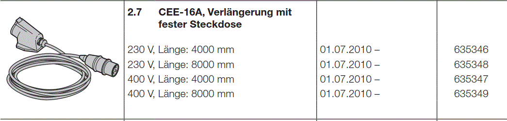 Hörmann CEE-16A Verlängerung mit fester Steckdose 400 Volt Länge 4000 mm