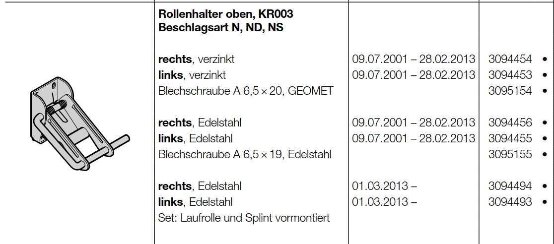 Hörmann Rollenhalter oben, KR003 Beschlagsart N, ND, NS rechts