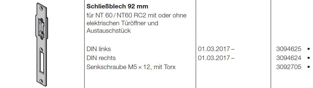 Hörmann Schließblech 92 mm DIN Rechts für NT 60-NT60 RC2 für die Industrietor-Baureihe 50