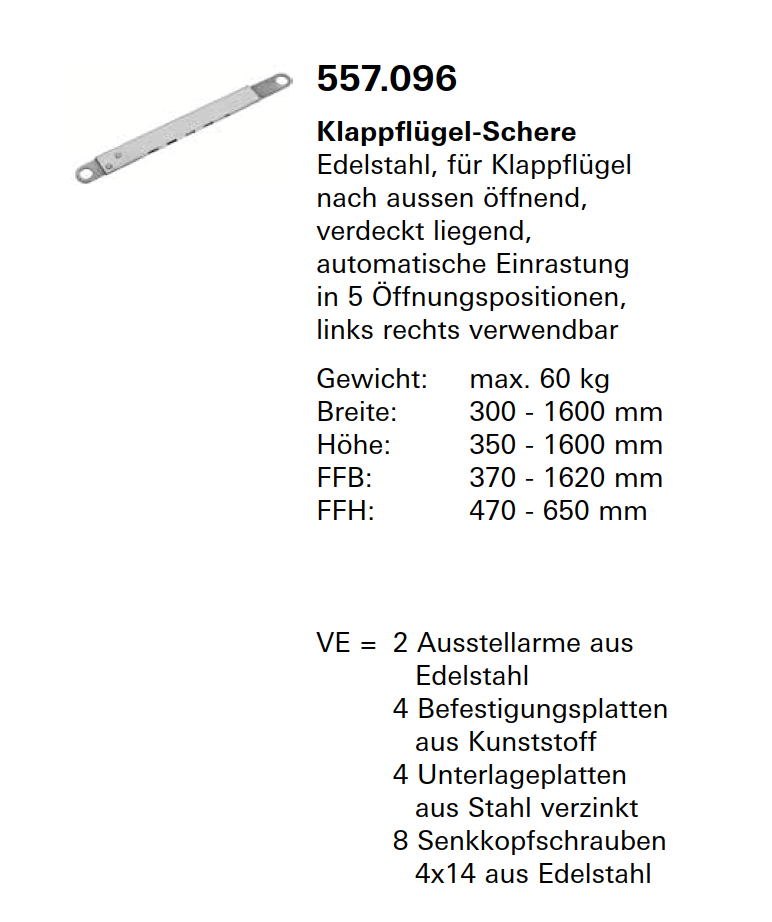 Jansen Janisol Arte 2.0, Klappflügel-Schere, Edelstahl, für Klappflügel, nach aussen öffnend, Artikel Nr.557.096