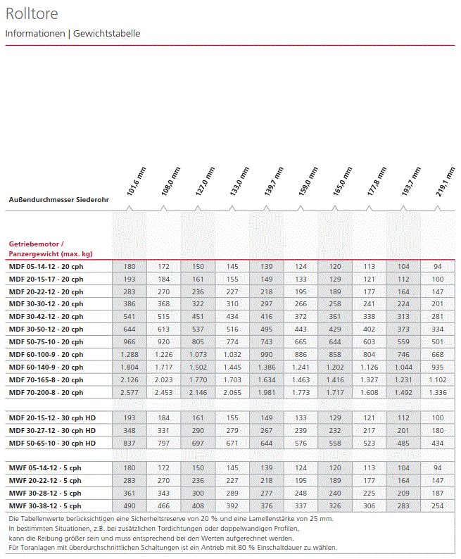 Abhängigkeit vom Durchmesser der Wickelwelle und des Panzergewichts.
