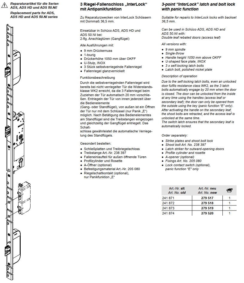 Schüco 3 Riegel-Fallenschloss „InterLock“ mit Antipanikfunktion, 241 872, 279 518, rechts