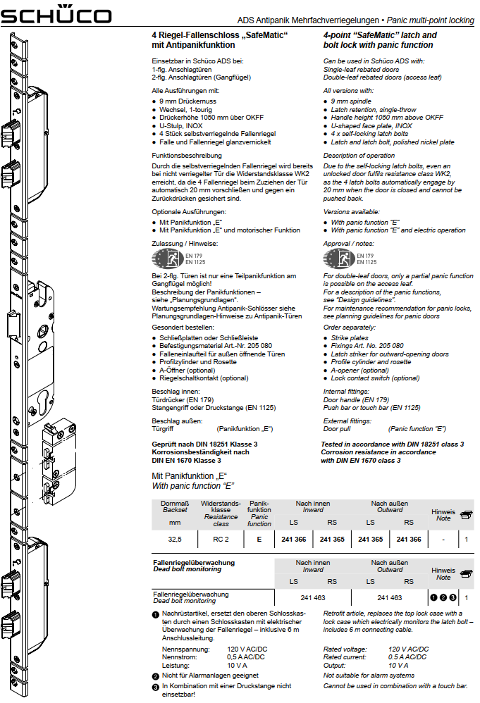 Schüco 4 Riegel-Fallenschloss „SafeMatic“ mit Antipanikfunktion, 241 365, nach außen LS, Panikfunktion E