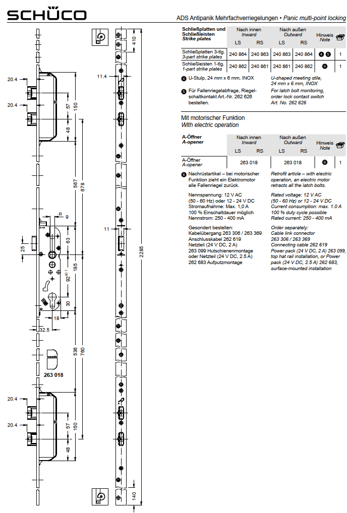 Schüco 4 Riegel-Fallenschloss „SafeMatic“ mit Antipanikfunktion, 241 366, nach innen LS, Panikfunktion E