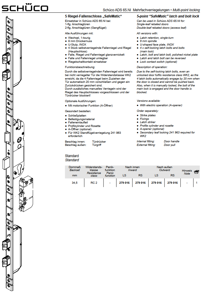 Schüco 5 Riegel-Fallenschloss „SafeMatic“, 279 016, ADS 65.NI
