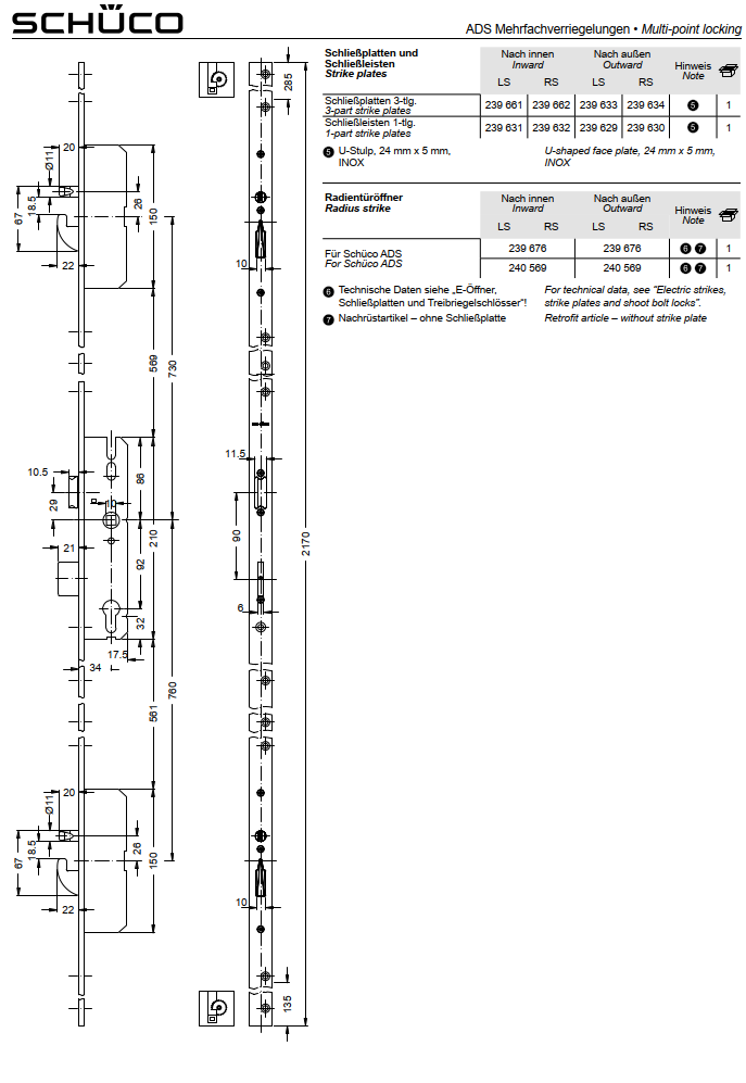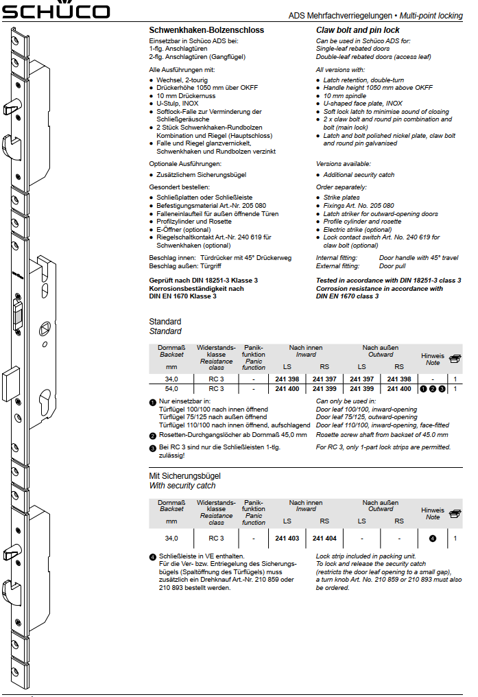 Schüco ADS Mehrfachverriegelungen, Schwenkhaken-Bolzenschloss, RC3, Dornmaß 34,0 mm, 241397, RS, nach innen