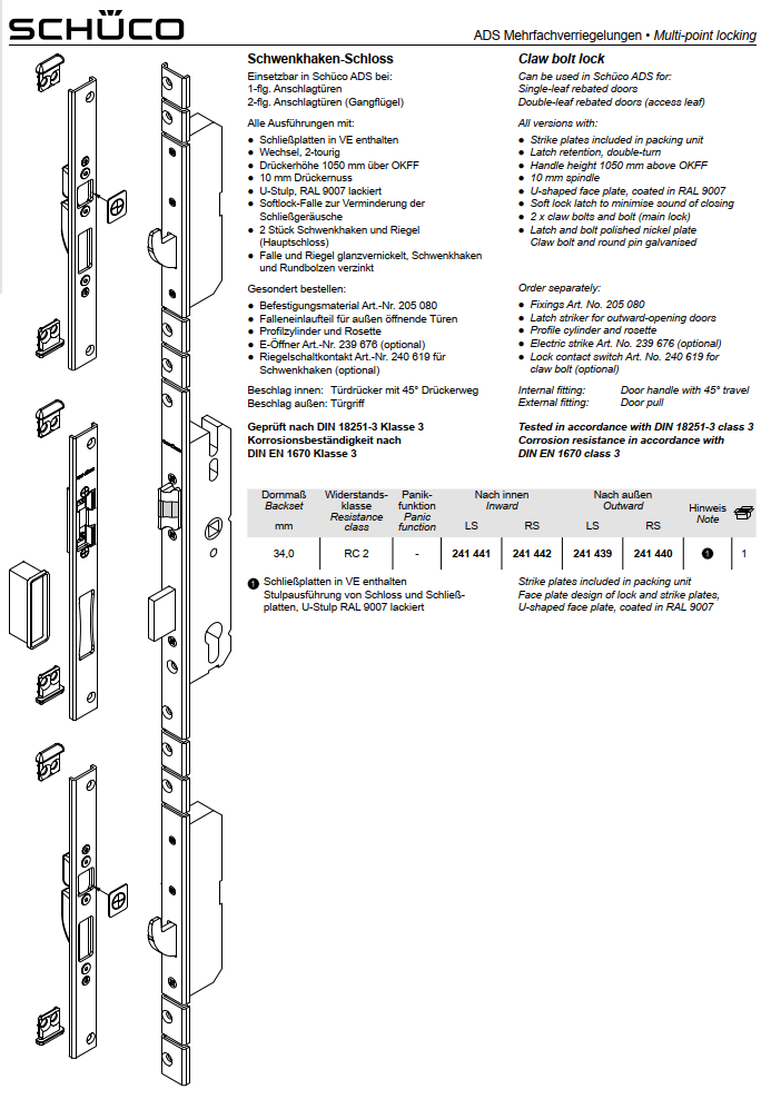 Schüco ADS Mehrfachverriegelungen, Schwenkhaken-Schloss, RC2, Dornmaß 34,0 mm, 241441, LS, nach innen