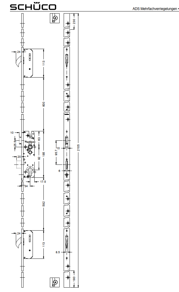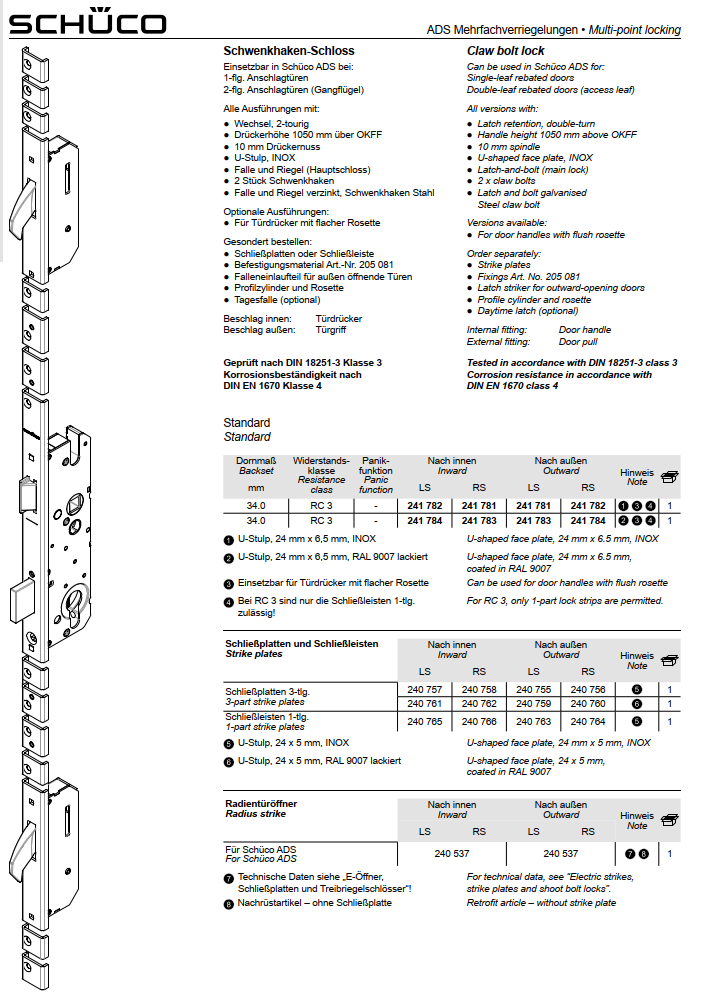 Schüco ADS Mehrfachverriegelungen, Schwenkhaken-Schloss, RC3, Dornmaß 34,0 mm, 241782, LS, nach innen