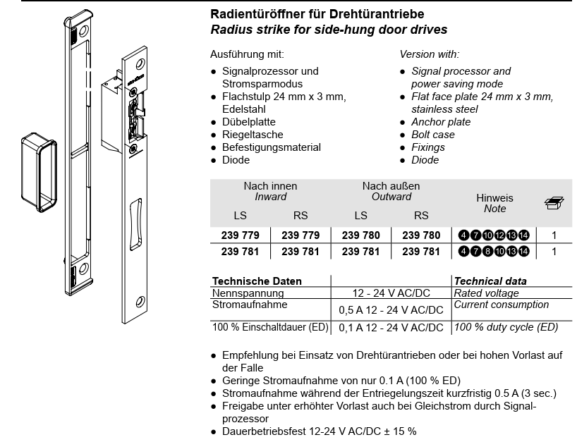 Schüco ADS Radientüröffner für Fallenschloss in Kombination mit Drehtürantrieben, 240371, LS/ RS nach außen