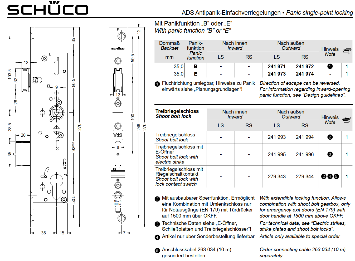 Schüco Antipanik Riegel-Fallenschloss, 241 973, ADS nach außen LS, mit Panikfunktion E