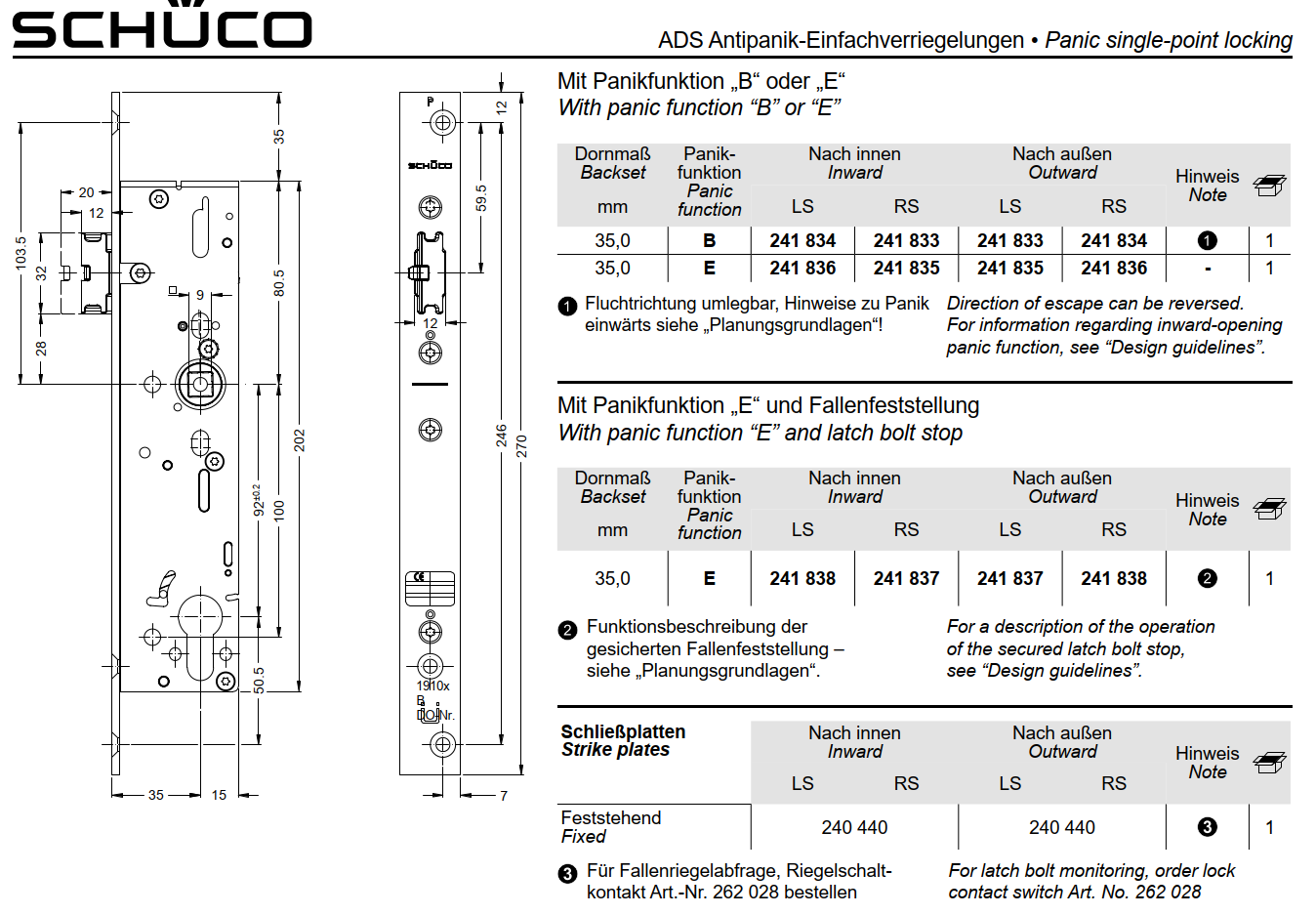 Schüco Antipanik Riegel-Fallenschloss selbstverriegelnd, 241 836, ADS, nach innen LS, mit Panikfunktion E