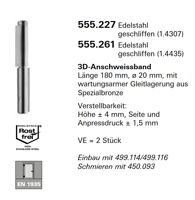 Schüco Jansen 3D-Anschweissband Länge 180 mm, ø 20 mm, Edelstahl geschliffen 1.4307, Artikelnummer 555.227, Janisol HI Türen