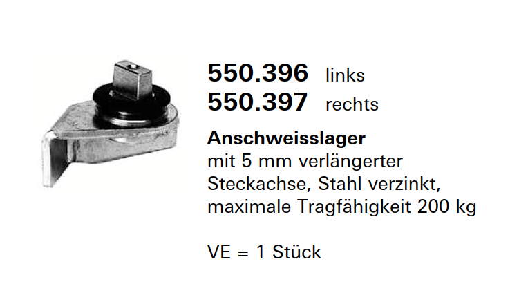 Schüco Jansen Anschweisslager mit 5 mm verlängerter Steckachse, Stahl verzinkt, Artikelnummer 550.396 links