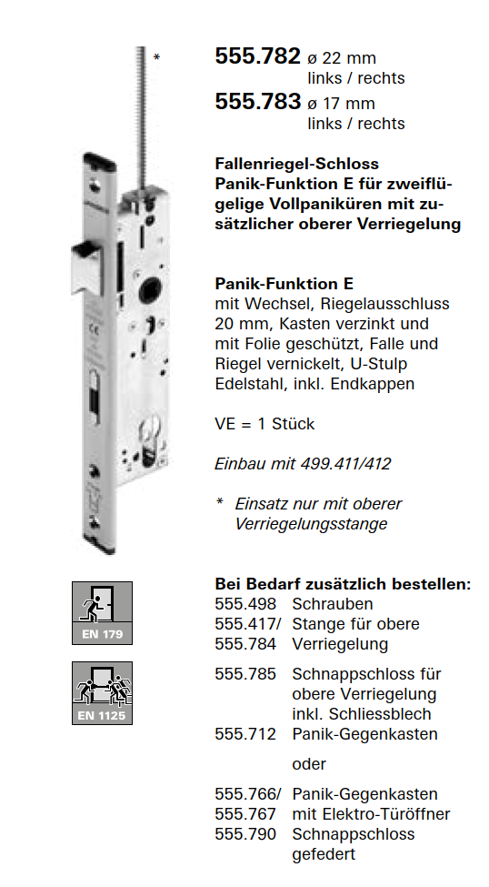 Schüco Jansen Fallenriegel-Schloss Panik-Funktion E, Artikelnummer 555.783 ø 17mm links/rechts, Janisol HI Türen