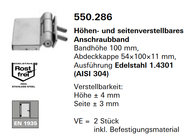 Schüco Jansen Höhen- und seitenverstellbares Anschraubband, Ausführung Edelstahl, Bandhöhe 100 mm, Artikelnummer 550.286