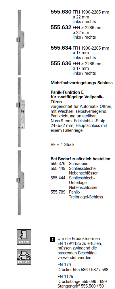 Schüco Jansen Janisol HI Türen, Panik-Funktion E für zweiflügelige Vollpanik- Türen, Artikelnummer 555.632, FFH 2286 mm ø 22 mm