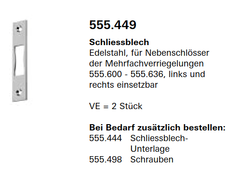 Schüco Jansen Janisol HI Türen, Schliessblech Edelstahl, für Nebenschlösser der Mehrfachverriegelungen, Artikelnummer 555.449