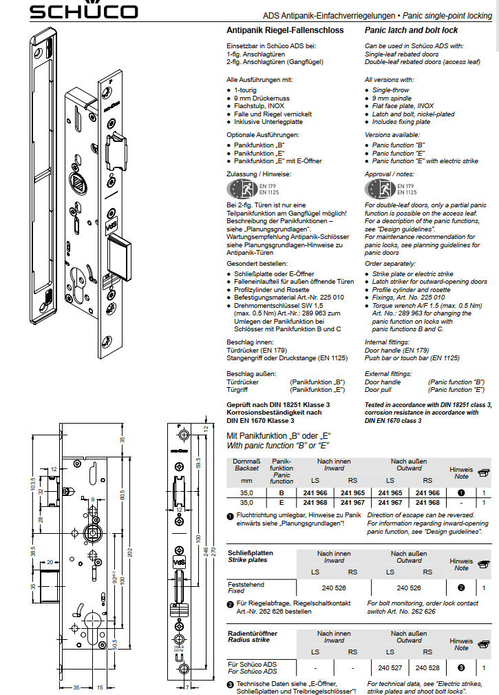 Schüco Riegel-Fallenschloss Antipanik, 241 965, ADS, nach außen LS, mit Panikfunktion B