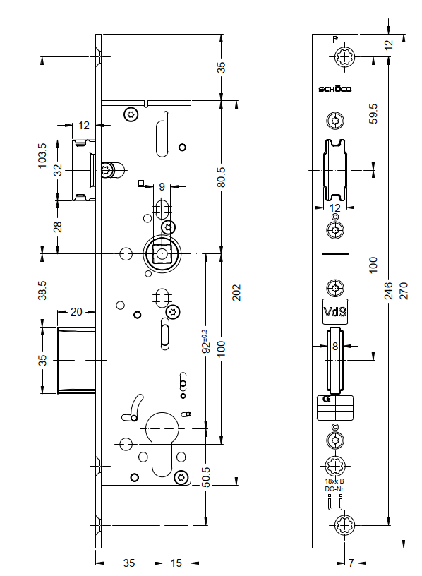 Schüco Riegel-Fallenschloss Antipanik, 241 965, ADS, nach innen RS, mit Panikfunktion B