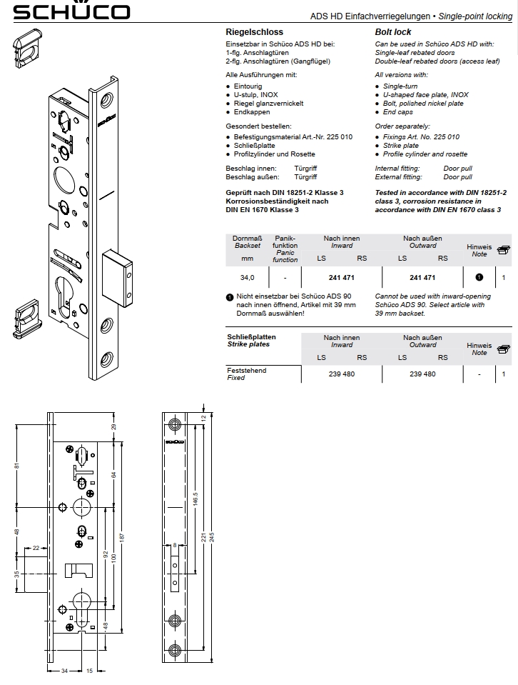 Schüco Riegelschloss, 241 471, L/R, ADS HD Einfachverriegelungen