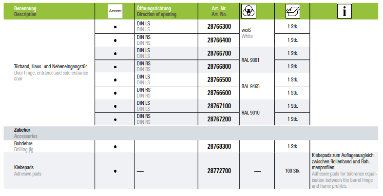 Schüco Rollenband Haustür, CT 70 Accent (19017...), 28766300, weiß, DIN Links