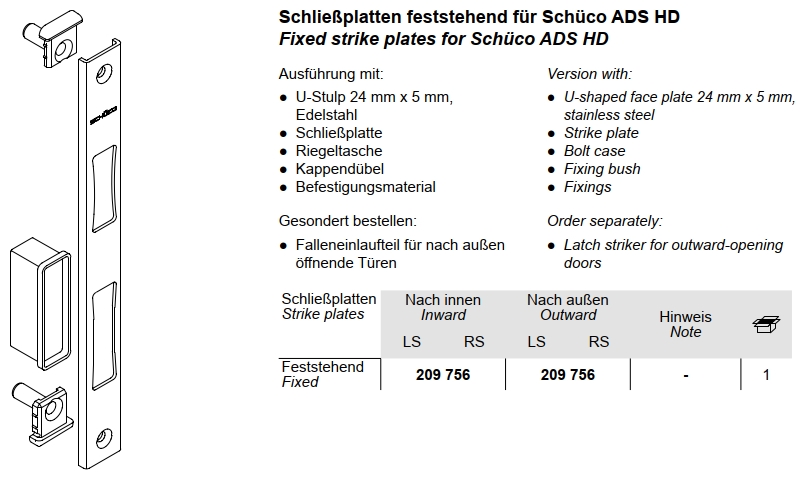 Schüco Schließplatten feststehend für Schüco ADS HD , 209 756