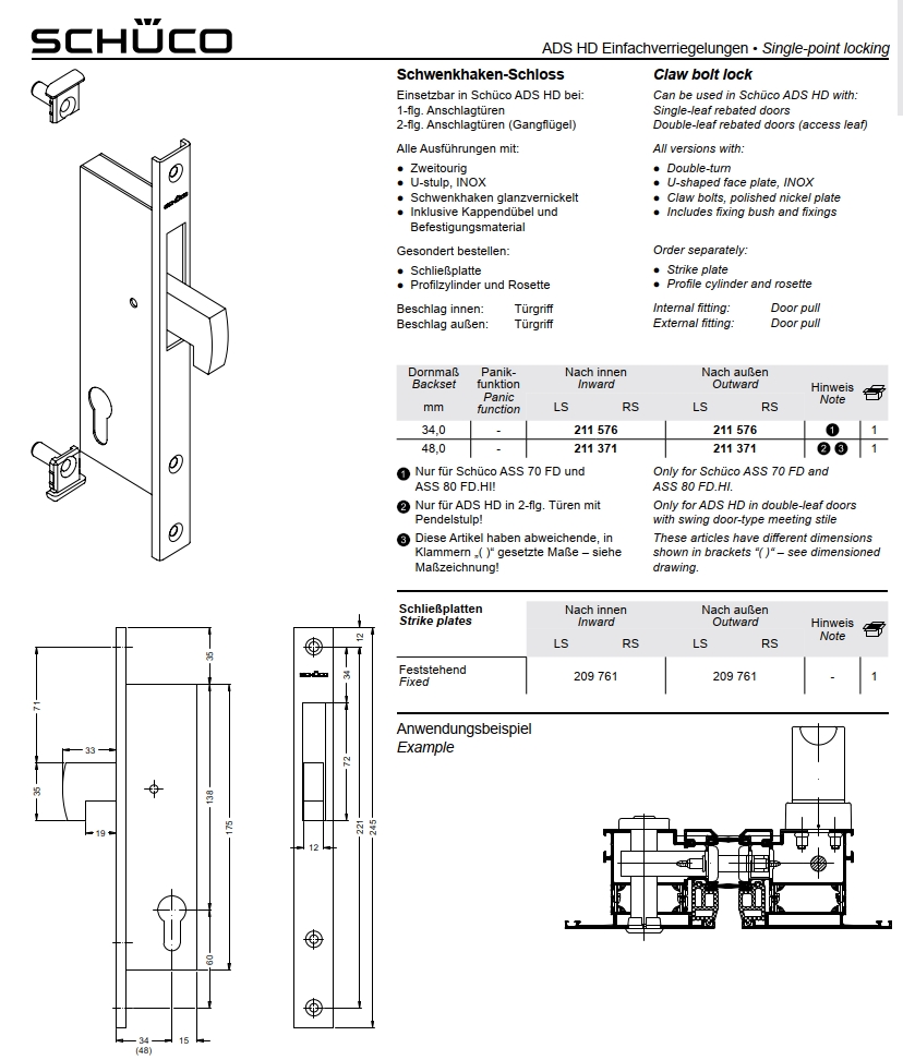 Schüco Schwenkhaken-Schloss, 211 371, L/R, ADS HD Einfachverriegelungen