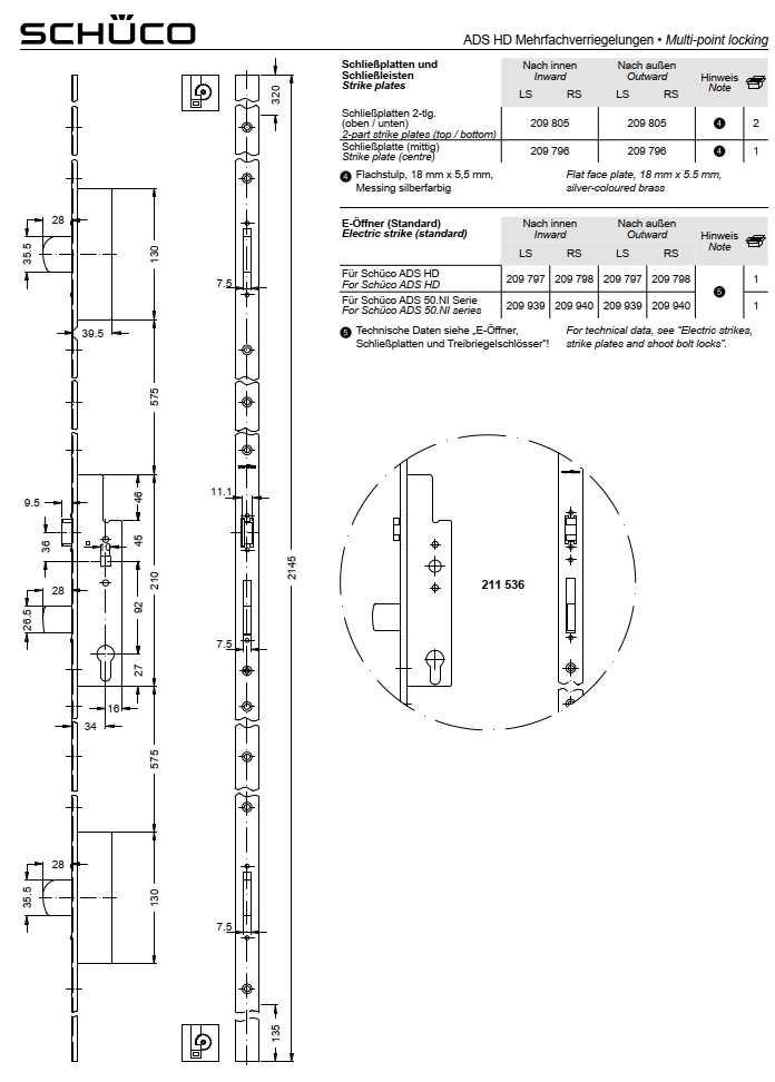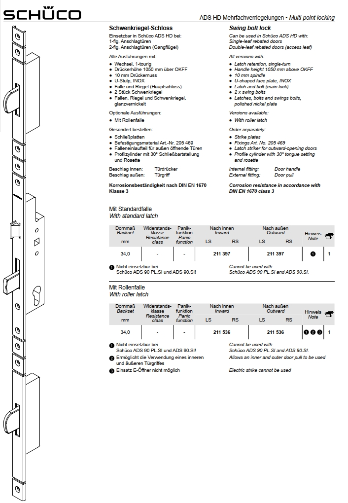 Schüco Schwenkriegel-Schloss, 211 397, RS/LS, ADS HD Mehrfachverriegelungen